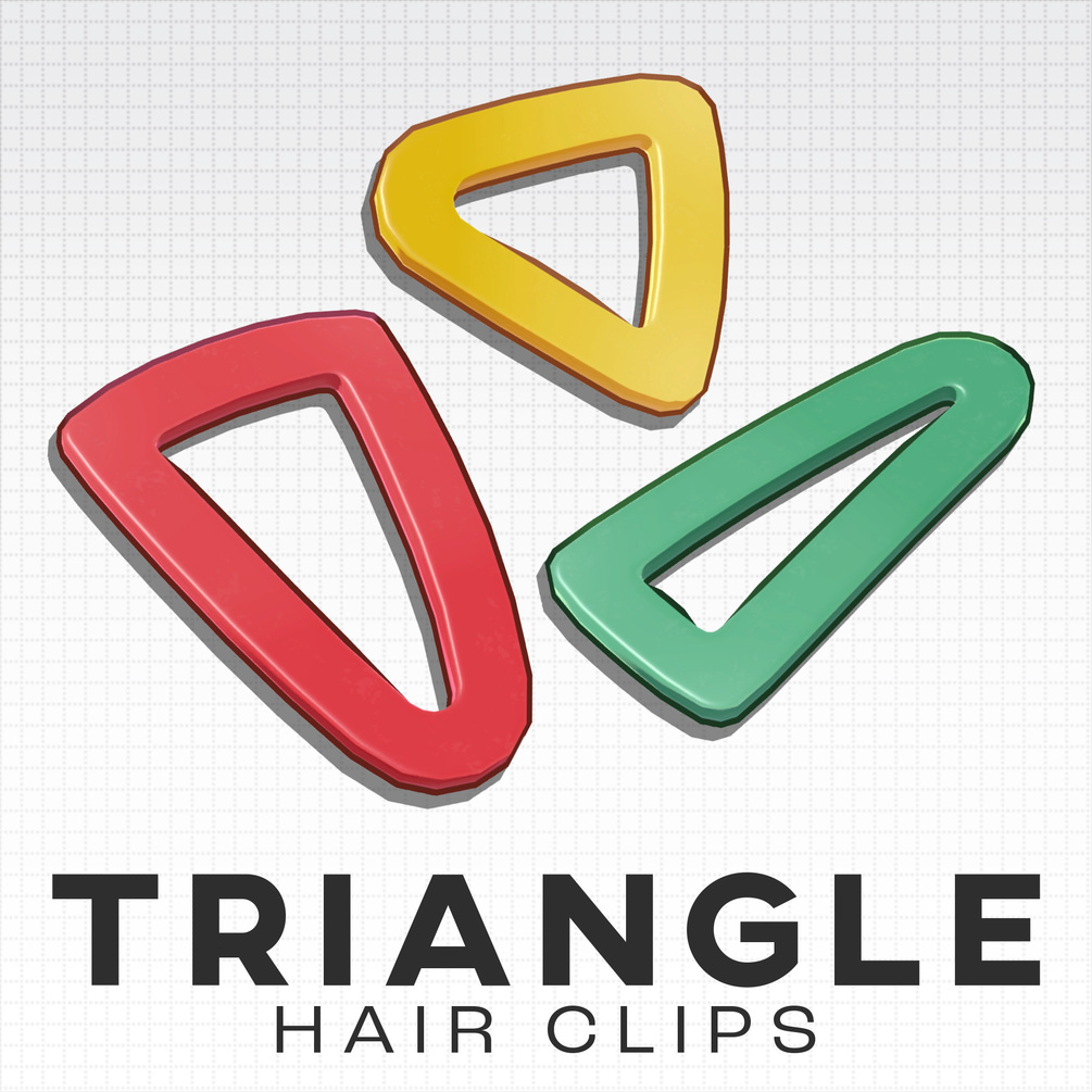Contains 3 triangular shaped hair clips and 9 colour options for each. The shape of these hair clips can be adjusted to fit a wide variety of hair styles by modifying the included BlendShapes across two axis.